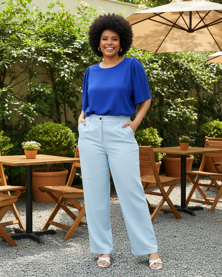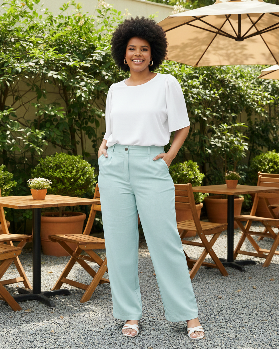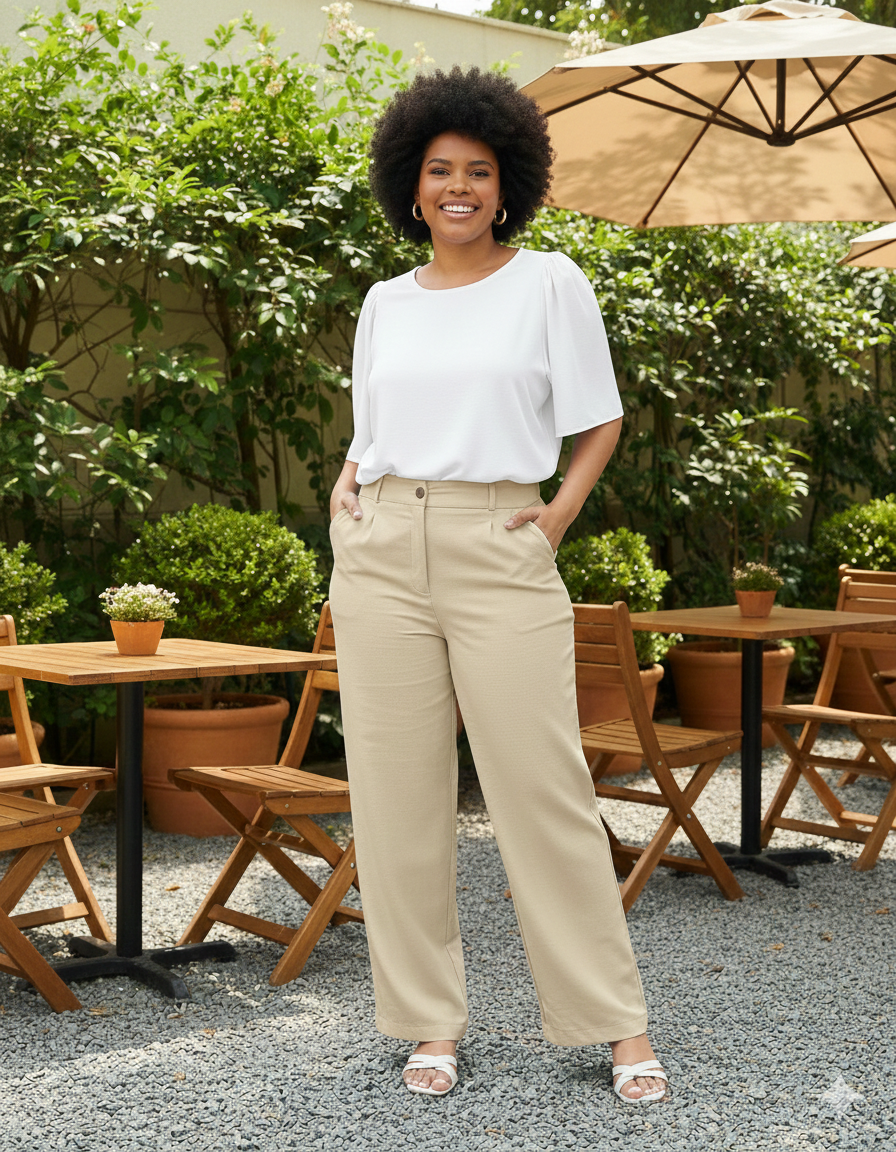 Calça em tecido de linho com elastano, equipada com botão e zíper funcionais na parte frontal. Possui dois bolsos laterais e dois bolsos traseiros, oferecendo praticidade e estilo.